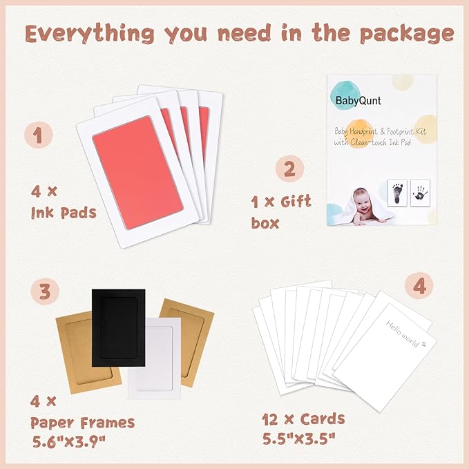 • 【Easy to use】: This baby fingerprint kit are very easy to use and it takes less than a minute to make these precious newborn keepsakes. Pay attention to which side is the ink side. The ink side faces the imprint card, and then gently press hand or foot on the other side with the plastic layer. After the imprint is completed, wait for the ink to dry before touching it. It usually takes 2 hours. Practice on plain paper with clean hands or feet before use to ensure you can make better stamp.