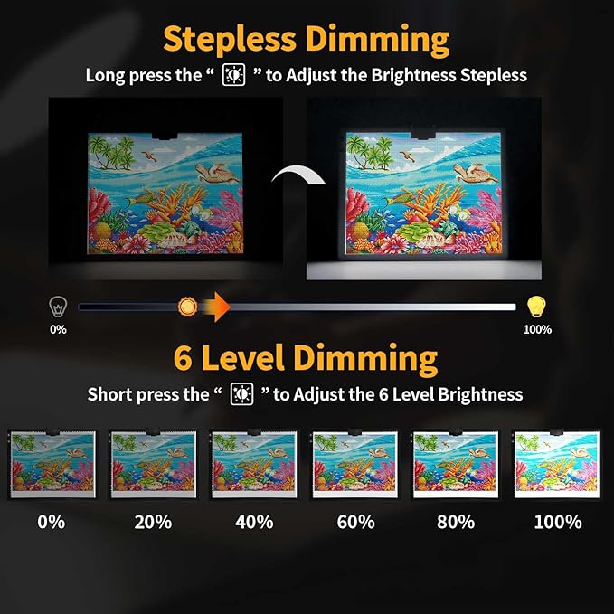 • 【Three Color Temperature Stepless Dimming】 The A3 light box can achieve 0-100% brightness control and has a memory function. press the button to turn ON/OFF the light board and change the lighting mode to white, warm yellow, or warm white. Each color mode has 6 brightness dimming options,long pressing the touch button can change the brightness steplessly. 6500K, bright enough, even light, not glaring, adaptable to art works in different environments, no longer eye fatigue when painting.