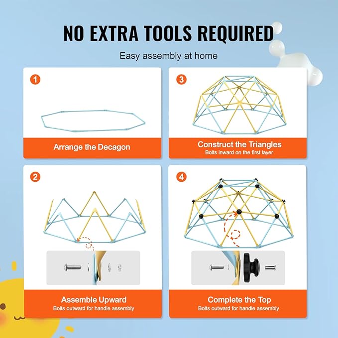 • Easy Setup: Everything you need is included, from installation tools to detailed manuals and video guides. Our clear instructions will effortlessly guide you through assembly, allowing you to quickly create a fun playground for your children with our kids climbing dome.