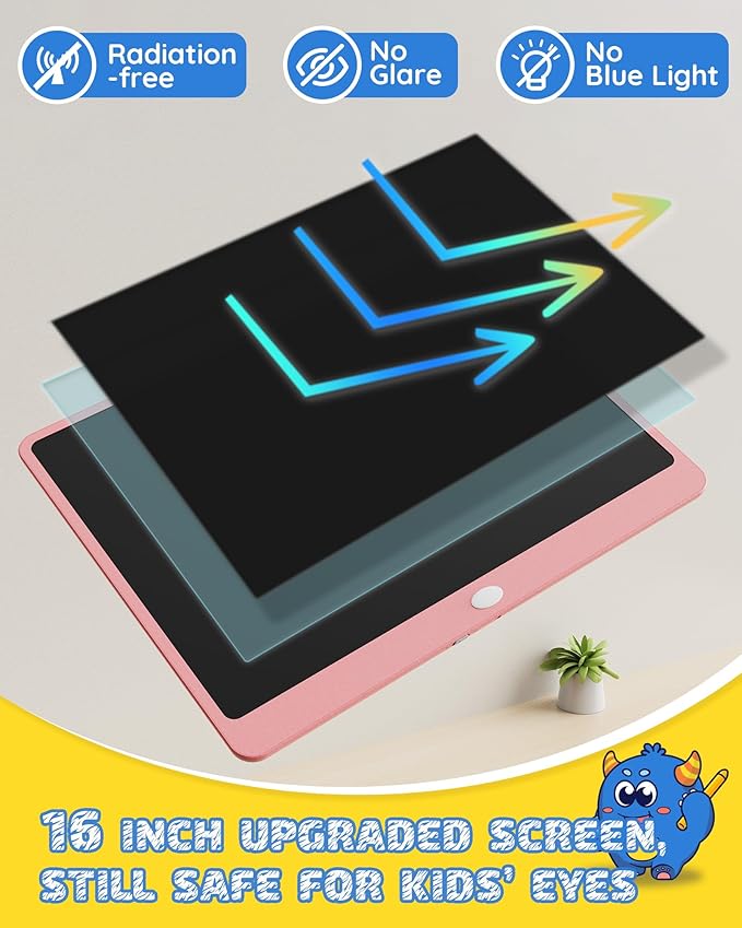 • Upgraded 16-inch Large Screen:The large 16-inch color screen writing space is large enough to be like A4 paper. Let your kids let their imagination run wild, draw, write, spell, count, play games, and have all kinds of creative fun. The pen string can be attached to the doodle board so it won't get lost