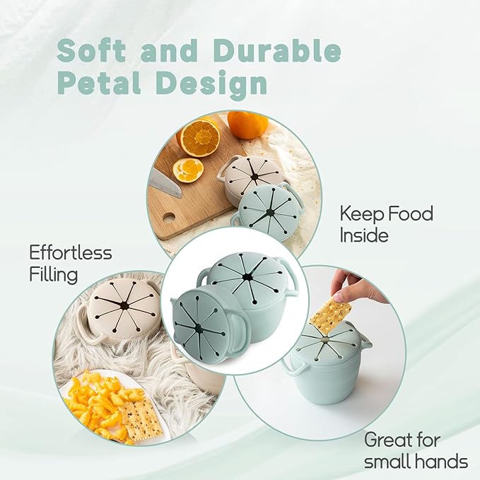 • Spill Proof and Convenient: These silicone snack cups for toddlers feature a flexible, petal-like opening to prevent spills and allow easy access to snacks. Their collapsible design makes them good for travel and storage.
