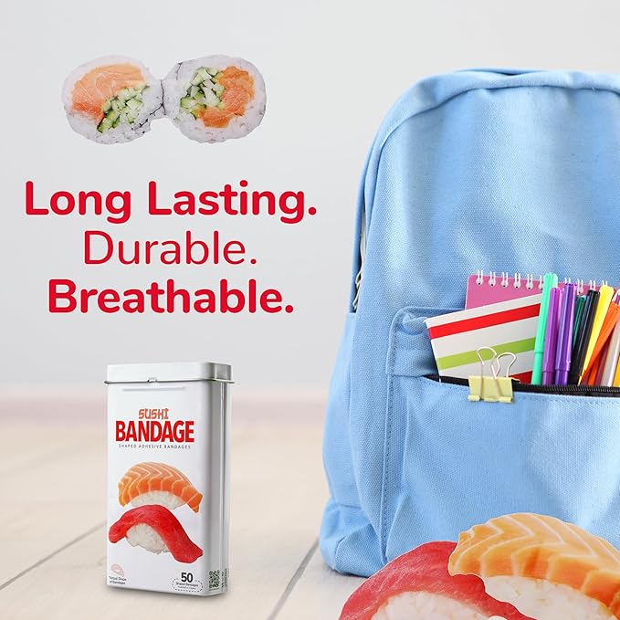 • SUSHI BANDAGES: This 50 piece tin of adorable and delicious looking sushi bandages is great for putting a smile on kids' faces while protecting wounds such as cuts, scrapes, and burns; sticky bandages are perfect for kids and adults alike, and also for school nurses and pediatric doctors