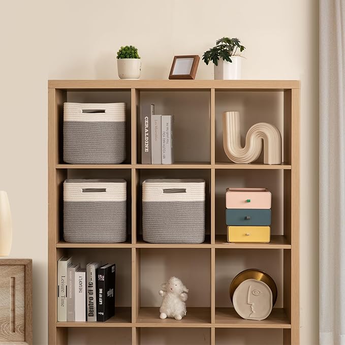 OIAHOMY Cube Storage Basket, 3-Pack Woven Cotton Rope Baskets for Storage, 11-Inch Cube Basket with Handles, Great for Shelves, Closets, Children's Toy Storage and Organization-White & Grey