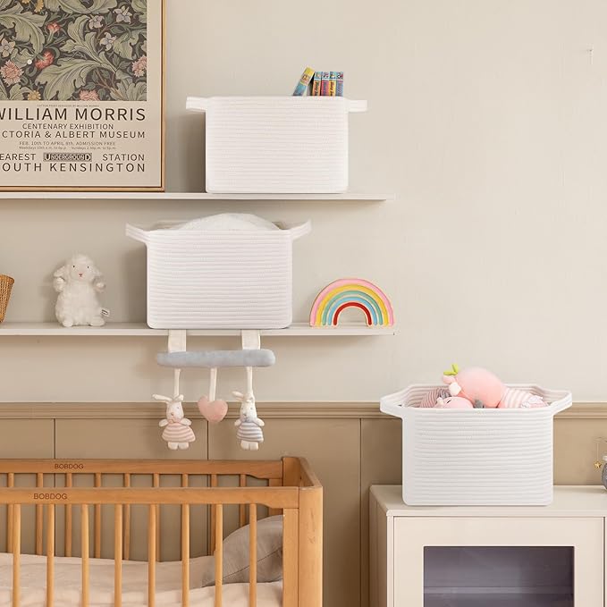 • Sturdy & Long-lasting: Made of high-quality natural cotton rope, these woven baskets are exceptionally durable & sturdy and firm enough in regular use. They can keep their shape even with heavy use. Each nursery basket with handles for easy carry
