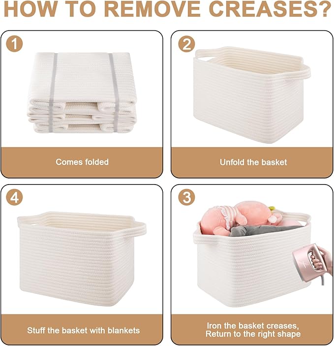 • Important Note: The premium toy baskets are packed compact for shipping, you may find some crease on the item, you can fully fill the basket with towels or clothes to reshape the basket. Steaming or Ironing could reshape the basket as well