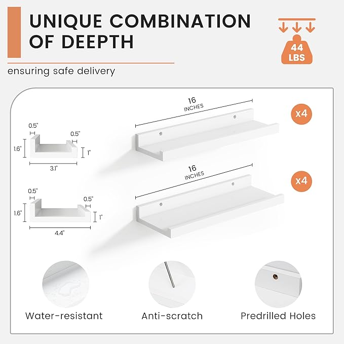 • 【Versatile and Multi-Functional】These shelves aren’t just for photos! FLYJOE ledge shelves can be creatively used as kids' bookshelves, display shelves for collectibles, spice racks in the kitchen, or even over-the-toilet storage in the bathroom. Their adaptability makes them a practical choice for any room in your home