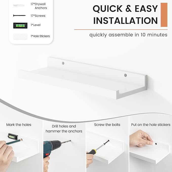 • 【Easy to Install】FLYJOE picture ledge shelves are quick and easy to install! Each set comes with pre-drilled holes and all necessary hardware, including a mini level for perfect alignment. With simple instructions, you can have your shelves up in minutes, allowing you to start decorating right away