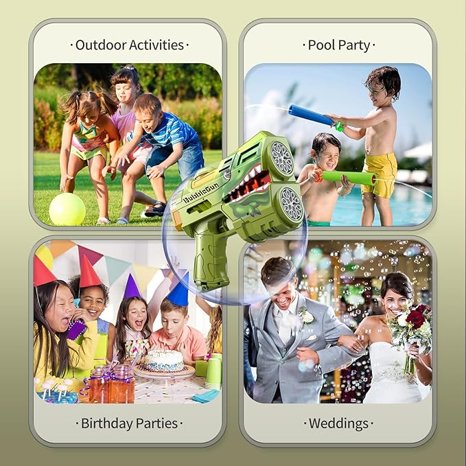 • Ideal Gifts for Any Occasion - The toddlers bubble maker comes in a beautifully packaged box with complete accessories . It is the perfect gift for kids toddlers over three years old. The bubble gun blaster also makes a great bubbles toy bag for these indoor and outdoor occasions, perfect for theme parties, carnivals, birthday parties, camping trips, Halloween, weddings, school classrooms, Easter baskets, outdoor water toy play activities, beaches, backpacking, backyard Bubble party etc