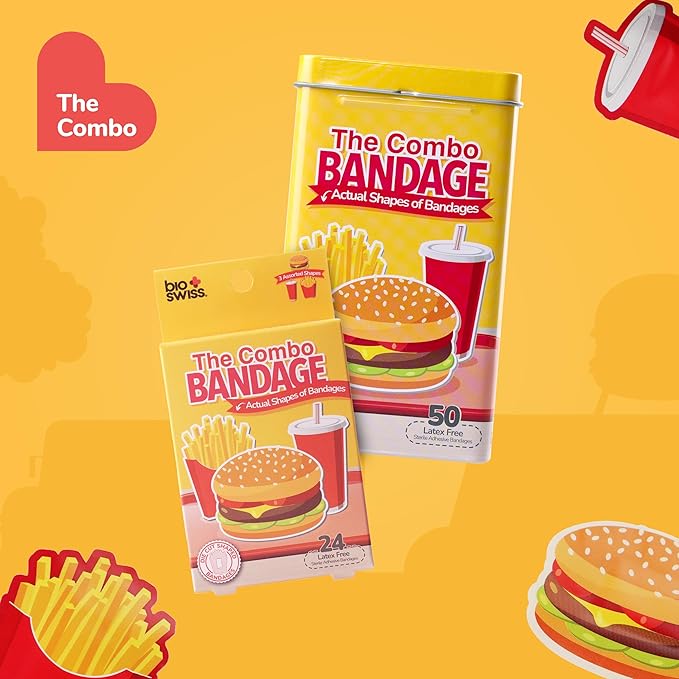 BioSwiss Bandages, Combo Meal Shaped Self Adhesive Bandage, Latex Free Sterile Wound Care, Fun First Aid Kit Supplies for Kids, 50 Count