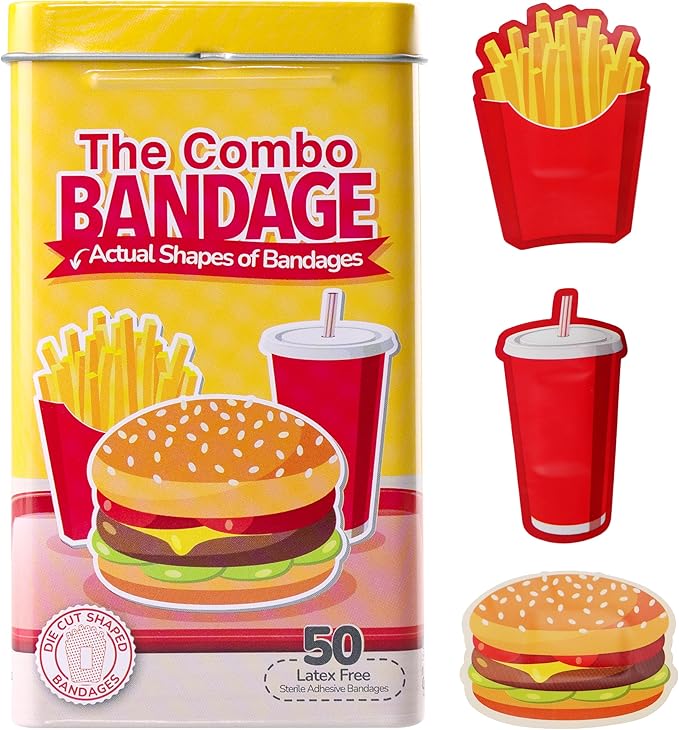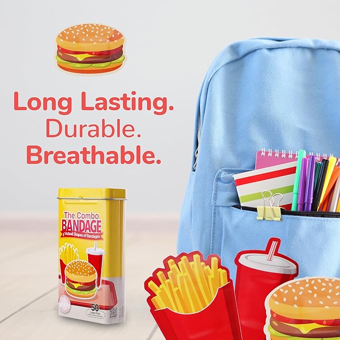 • COMBO MEAL BANDAGES: This 50 piece pack of adorable fast food shaped bandages is great for putting a smile on kids' faces while protecting wounds such as cuts, scrapes, and burns and comes in an assortment of french fries, burgers, and soda shapes; sticky bandages are perfect for kids and adults alike, and also for school nurses and pediatric doctors