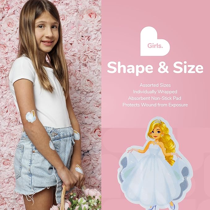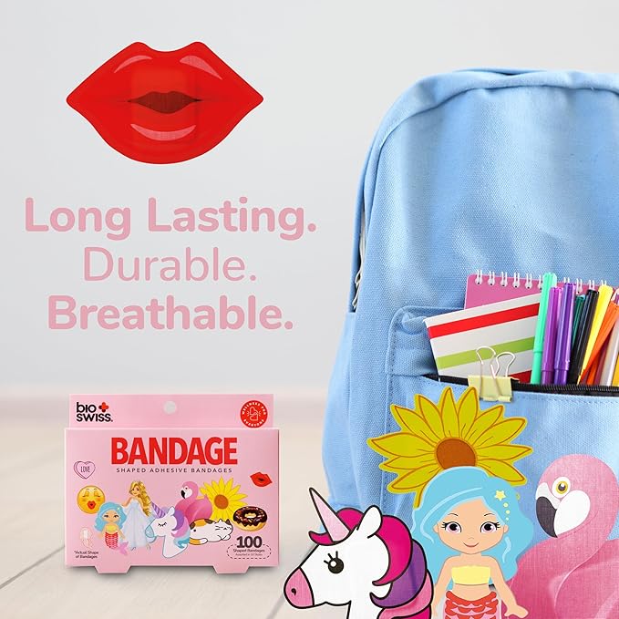 • ASSORTED BANDAGES: This 100 piece pack of adorable assorted girls bandages is great for putting a smile on kids' faces while protecting wounds such as cuts, scrapes, and burns, and come in 10 assorted styles (donut, kissy face, lips, cat, heart, flamingo, mermaid, cinderella, unicorn, and sunflower); sticky bandages are perfect for kids and adults alike, and also for school nurses and pediatric doctors