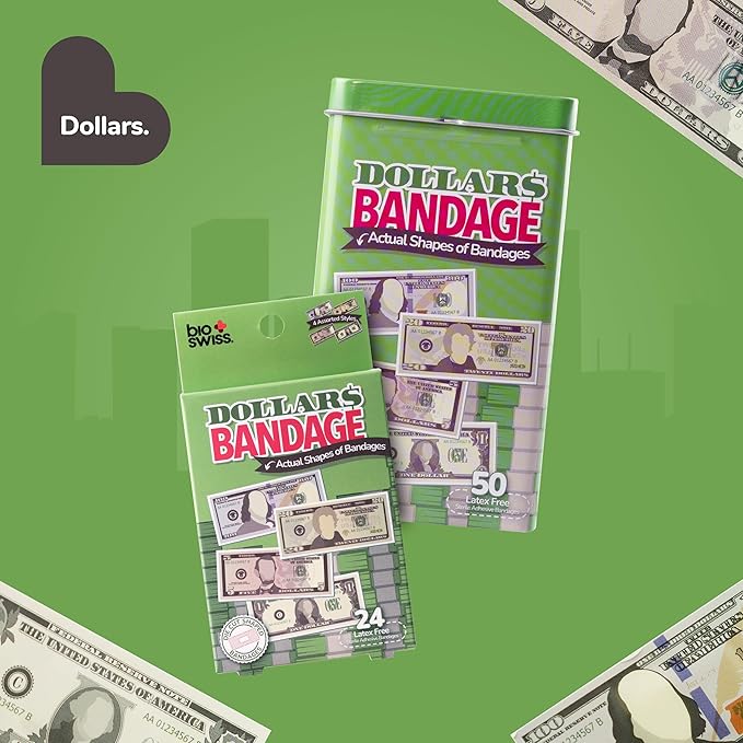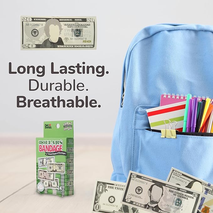 • MONEY BANDAGES: This 24 piece pack of adorable dollar bill shaped bandages is great for putting a smile on kids' faces while protecting wounds such as cuts, scrapes, and burns; sticky bandages are perfect for kids and adults alike, and also for school nurses and pediatric doctors