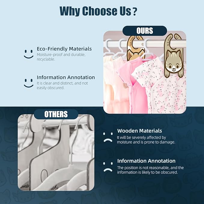 • 【Easily Divide Baby Clothes】 With clear, easy-to-read labels for different sizes and types of clothing, these 8 pack of baby closet dividers make it simple to organize and locate your baby's outfits at a glance. The baby clothes hanger dividers enhanced clarity. Each baby dividers for closet includes dividers for baby age ranges and clothing sizes, from newborn to toddler, ensuring that as your baby grows, their closet still remains neat and orderly.