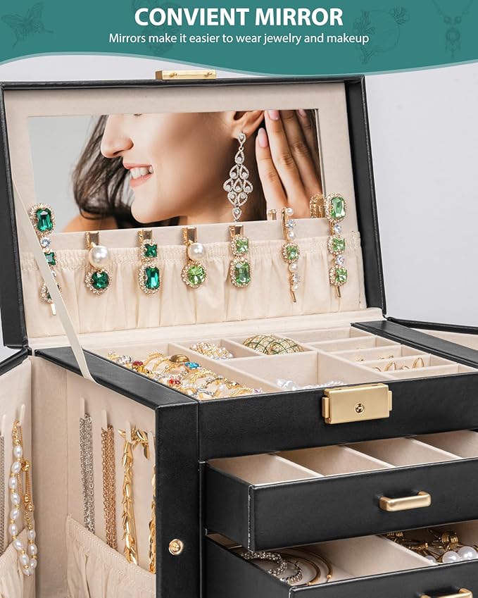 AKOZLIN Large 4-Tier Jewelry Box Leather Jewelry Storage Organizer with 3 Drawers Lockable for Women Girls Ring Necklace Earring Bracelet Watches Holder with Mirror Black