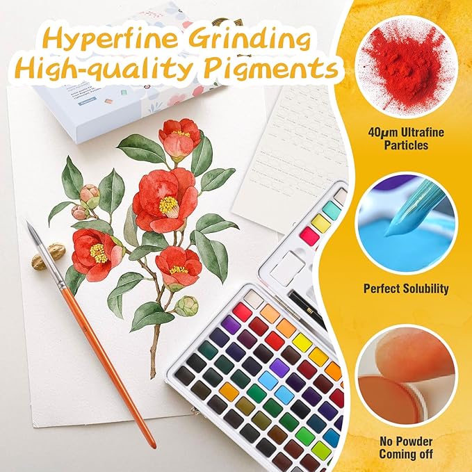• 【Upgraded 40μm Hyperfine Grinding Pigments】The colors are bright, rich, transparent, soluble, easy to color, easy to blend, create endless colors when mixed together, have excellent fluid, natural watercolor blooming effect.