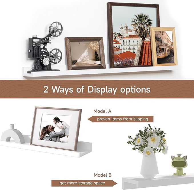 • MEMORIES SHOWCASE SHELF: Do you have a lot of memorable photos, but don't know how to display them, Fun Memories picture ledge shelves (especially in large sizes) are perfect for you to display them! With our hanging racks, you can store and display different types and sizes of photo frames in one place without worrying about