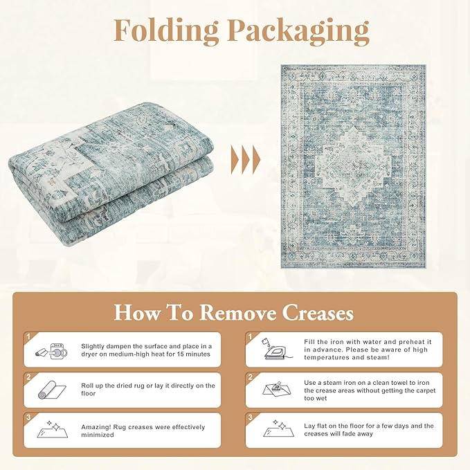 • Folding Packaging--Due to the folding during packaging, the blue area rug may have some creases upon opening. However, the edges are resistant to buckling, and the folds will disappear once the rug is laid flat and ironed.