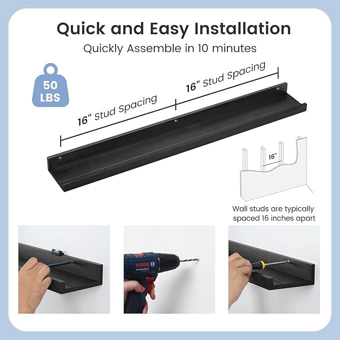 • Easy to Install: You will get a level, screws for the wall, drywall anchors, a detailed installation guide, and two beautiful hand-crafted solid pine wood shelves. With the level, you can make sure your picture ledge shelves are well aligned. Just follow the simple instruction to install the hanging shelves for wall decor within 10 minutes. We add additional screw and anchor to the hardware bag just in case. If you have any questions about our products, please feel free to contact us