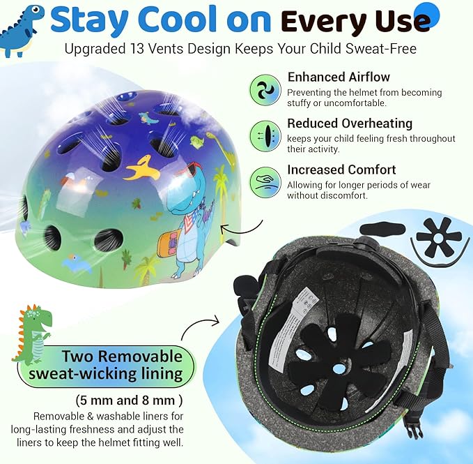 • Advanced Ventilation with a Snug Fit: The bike helmet kids 5-8 features a 13-vent design, 2 more than typical 11-vent ABS helmets, and keeps your child's head cool during sports. It includes two sets of removable, washable pads (5mm and 8mm) to fit different head shapes. Our kids bike helmets ages 5-8 offer easy adjustments with straps and a dial for a secure fit. A thick chin pad ensures extra comfort, while the quick-release buckle with padding allows for easy on/off without pinching.