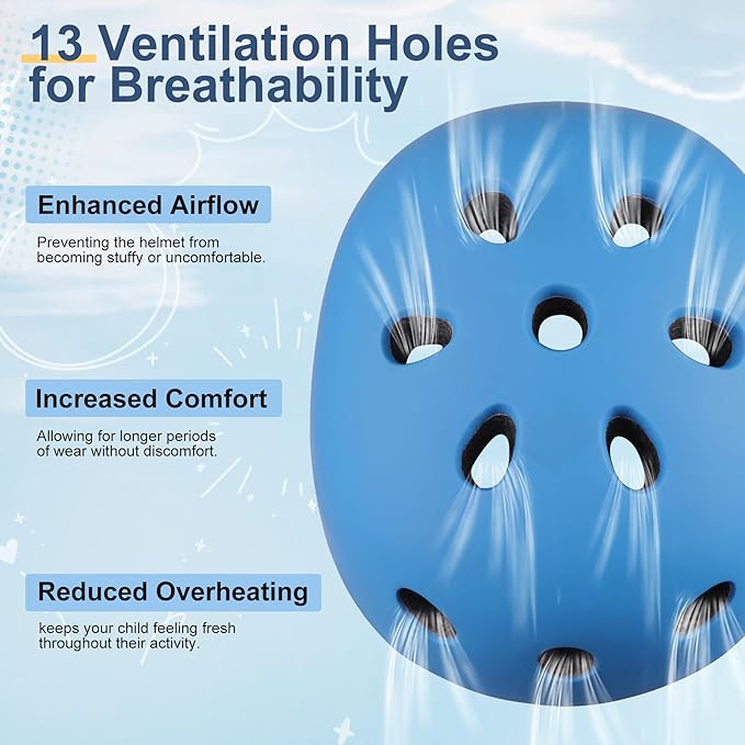 • VENTED & COMFORTABLE :13 air vent let air go through the kids helmet,Toddler skateboard helmet set can keep their heads cool even. Kids scooter helmet internal protective padding is soft, detachable and washable.Kids adjustable helmet with soft and comfortable chin pad, no more worries about that the straps may scratch child's skin