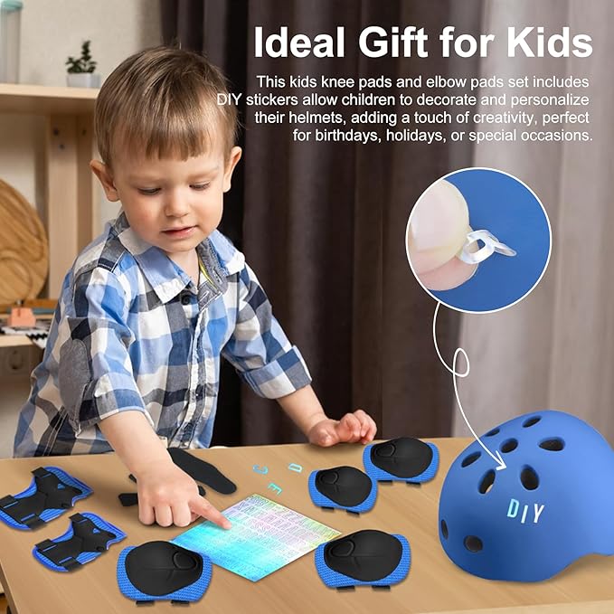• 9 in 1 CHILD PROTECTIVE GEAR SET : Kids Bike helmet protective gear for boys girls all-round and perfect protection, including 1 X Helmet, 2 X Elbow Pad, 2 X Wrist Pad, 2 X Knee Pad, DIY stickers, and a removable & washable liners foam liner, offering comprehensive protection for various activities like biking, skateboarding, and scootering