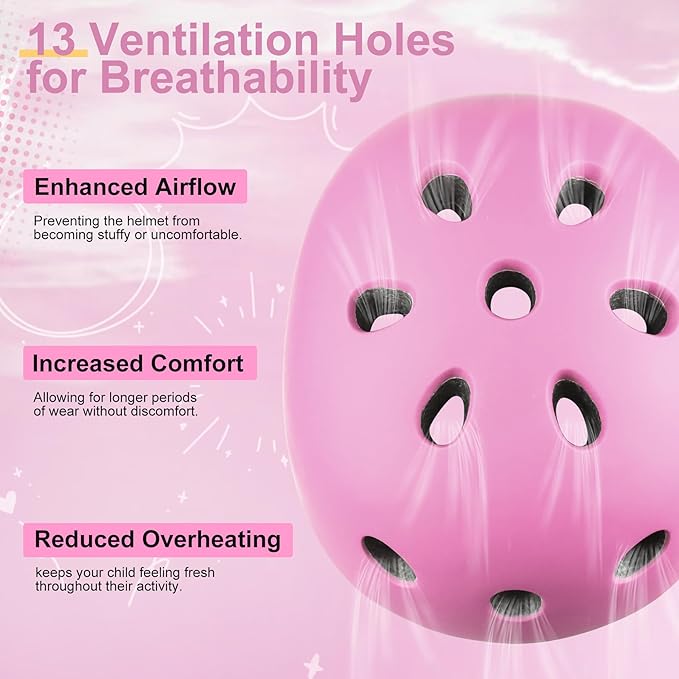 • Superior Safety with PC Shell: Unlike ABS helmets, Vvinca bike helmet features an in-mold PC shell combined with an EPS foam liner. This design ensures the helmet won't delaminate, offering a lightweight yet sturdy option that's perfect for children. The helmet is equipped with 13 ventilation holes, preventing overheating and providing comfort even during extended wear