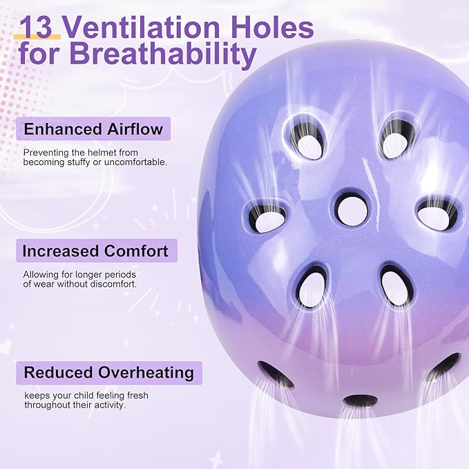 • Superior Safety PC Shell: Vvinca Color Gradient bike helmet is crafted from a lightweight, in-mold PC shell with an EPS foam middle layer, providing a safer and more durable alternative to ABS helmets. The one-piece design ensures it won't delaminate or crack, making it perfect for children. With 13 ventilation holes, the helmet stays cool and comfortable, even during extended wear