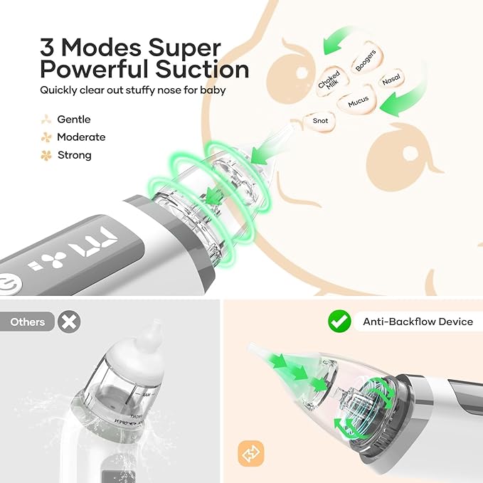 • 3 LEVELS OF SUCTION MODES - The nasal aspirator for baby has three levels of adjustable suction modes from weak to strong, quickly removes different types of nasal secretions (Choking milk, snot, etc)