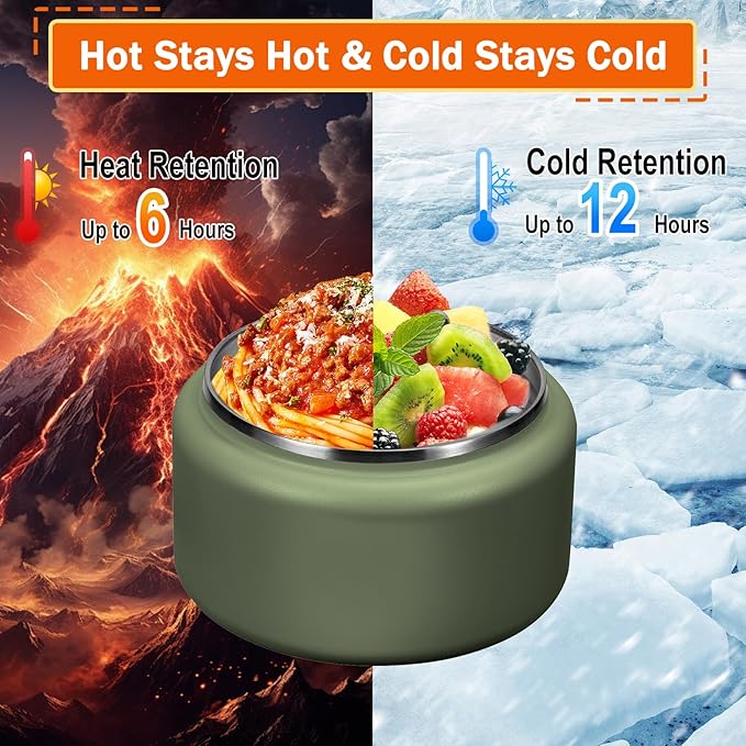 • Thermos for Hot Food: Made with 18/8 stainless steel and featuring a vacuum-sealed design, this food thermos keeps food hot for up to 6 hours and cold for up to 12 hours. It's completely reusable and made from eco-friendly, BPA-free, food-safe materials.