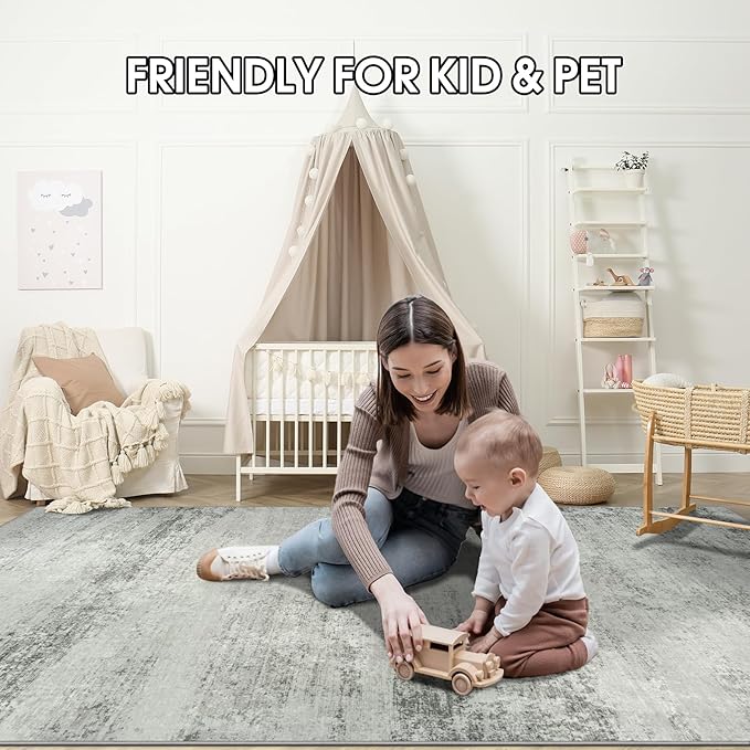 Area Rug 9x12 Washable Rugs: Abstract Large Living Room Rugs with Non-Slip Backing, Thin Carpet for Dining Room Table Bedroom Nursery Indoor Home Office-Gray