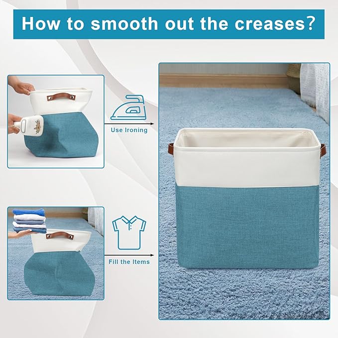 • 【Maintenance & Care Tip】 - Collapsible design for space saving. Our foldable baskets comes in a compression packing which may result in wrinkled storage bin during the long transit. Get rid of the wrinkles by either stuffing the fabric storage bins with blankets and pillows for a few days or steam iron them at low-heat setting. The organization baskets are easy to clean, you can dust the basket with a soft cloth with light soapy water when needed.
