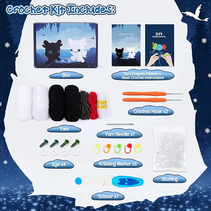 • 【All-In-One Crochet Kit】 Everthing in box: enough yarn and stuffing, crochet hook x2, eyes x4, knitting marker x5, yarn needle x1, scissor x1. In addition to the tools and materials, we come with two manuals - 2pcs Baby Dragons pattern and basic crochet instructions, as well as step-by-step video tutorials, which are perfect for beginners and kids to follow along with the videos and learn to crochet cute black and white baby dragons.