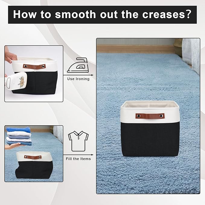 • 【Maintenance & Care Tip】 - Collapsible design for space saving. Our foldable baskets comes in a compression packing which may result in wrinkled storage bin during the long transit. Get rid of the wrinkles by either stuffing the fabric storage bins with blankets and pillows for a few days or steam iron them at low-heat setting. The organization baskets are easy to clean, you can dust the basket with a soft cloth with light soapy water when needed. Not recommended to machine wash.