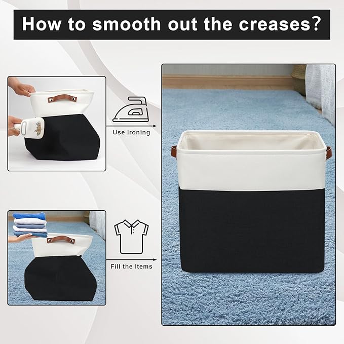 • 【Maintenance & Care Tip】 - Collapsible design for space saving. Our foldable baskets comes in a compression packing which may result in wrinkled storage bin during the long transit. Get rid of the wrinkles by either stuffing the fabric storage bins with blankets and pillows for a few days or steam iron them at low-heat setting. The organization baskets are easy to clean, you can dust the basket with a soft cloth with light soapy water when needed.