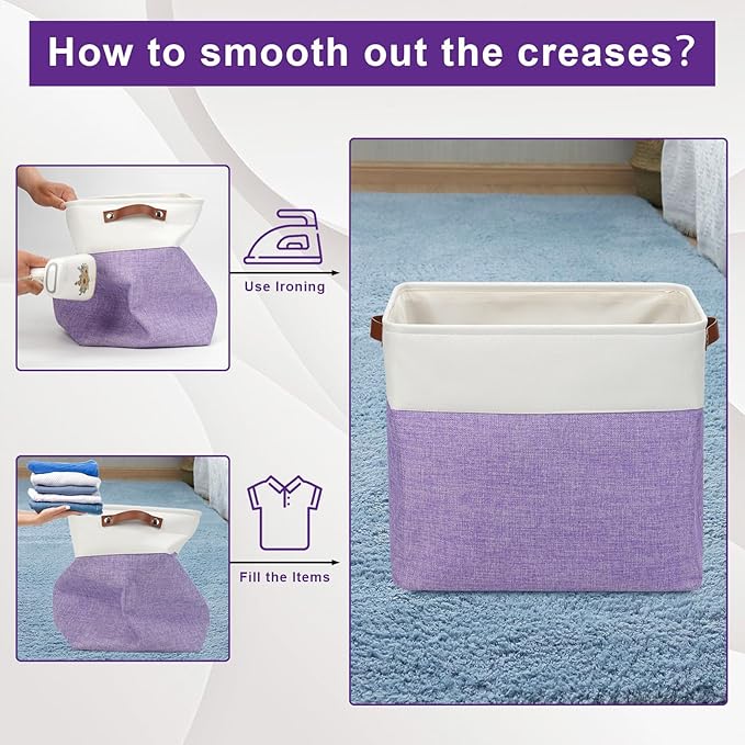 • 【Maintenance & Care Tip】 - Collapsible design for space saving. Our foldable baskets comes in a compression packing which may result in wrinkled storage bin during the long transit. Get rid of the wrinkles by either stuffing the fabric storage bins with blankets and pillows for a few days or steam iron them at low-heat setting. The organization baskets are easy to clean, you can dust the basket with a soft cloth with light soapy water when needed.