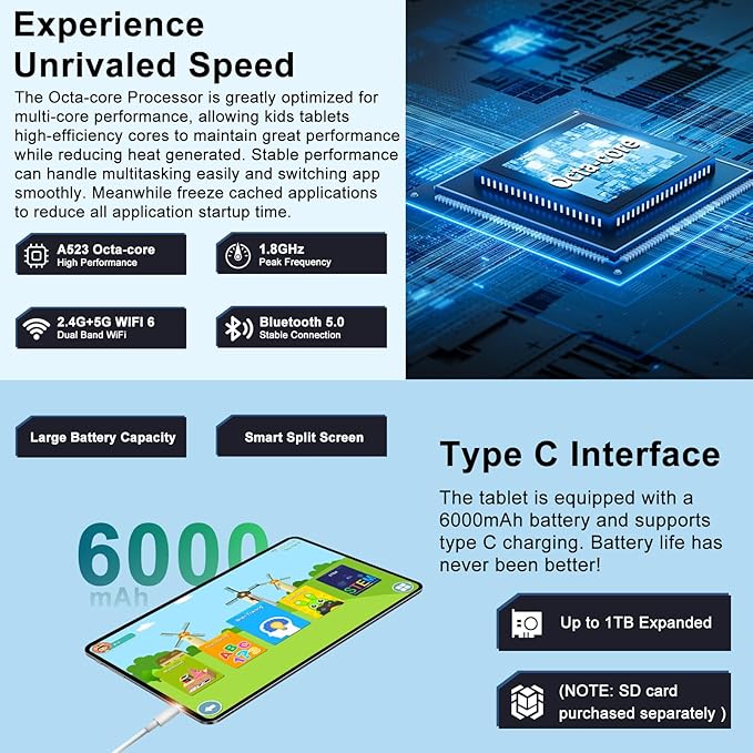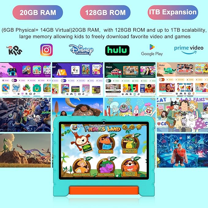 • 【20GB (6+14) RAM and 128GB Super ROM & 6000mAh Large Capacity Battery】 20GB ( 6GB Original + 14GB Expanded Virtual ) RAM + 128GB ROM (SD card expandable up to 1TB), it is able to run various apps compatibly and smoothly, and store your child's favorite movies, photos and apps, such as Kindle,Instagram,Disney+ and other daily required apps directly from the pre-installed play store to meet your child's diverse learning and entertainment needs. Let kids enjoy math, language, music, painting in the game. Equipped with a large 6000mAh battery, giving your child a stable and continuous use experience.