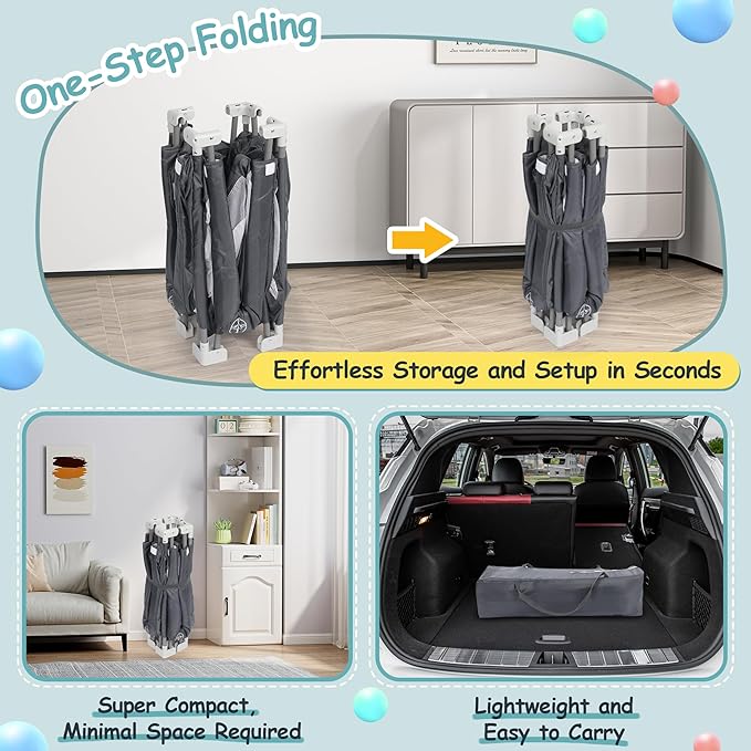• Sturdy and Safe Construction: Made from durable 210D Oxford fabric and reinforced with iron tubes, this folding baby playpen is built to last. The foam-padded handrails and non-slip bases add extra stability, ensuring your baby’s safety during playtime.