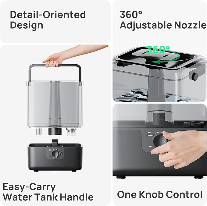 • 6L Large Water Tank: The humidifiers for bedroom can run for up to 50 hours at a time in the lowest output mode. A red light indicator will let you know when it is time to refill the water and will automatically stop misting when the water level drops too low. Note: If there is water leakage during the first use, please pour out the water in the water tank and base. Try taking down the water tank separately to fill it with water, then putting it back on the base and restarting it