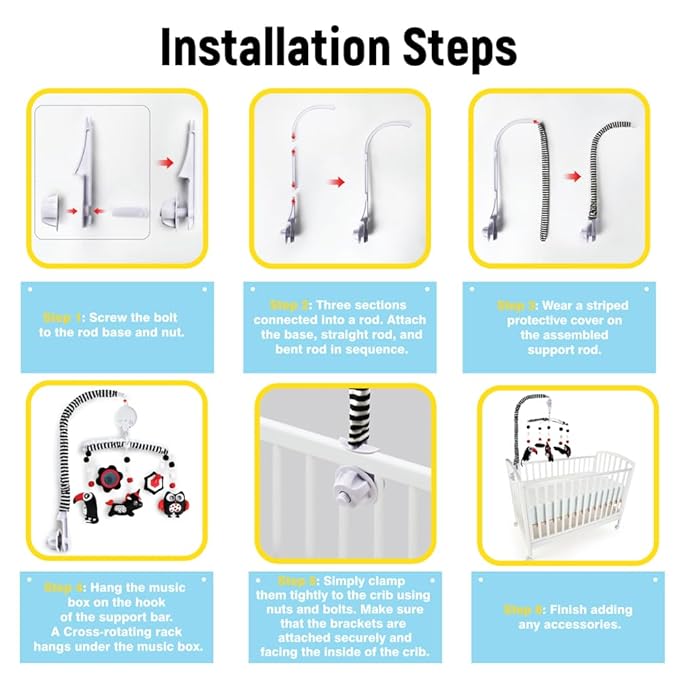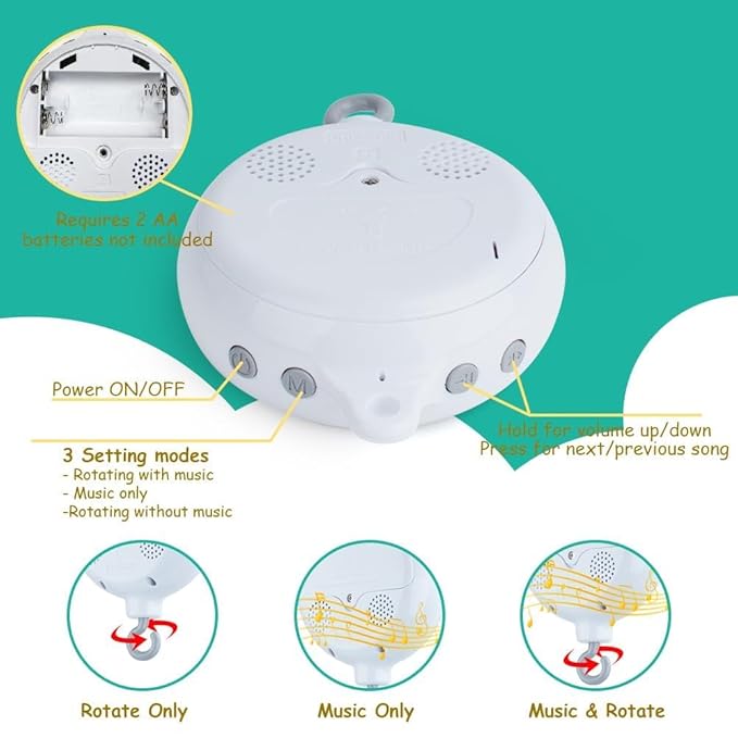 • ♫ MADE FOR BABY'S VIEW - UPGRADED MUSIC BOX, Easy to install, no screw needed,Requires 2 AA (not included). The baby mobile is made of safe ABS material, and the cute soft crib toys are handmade from high-quality stretch cotton, offer your baby harmless using experience. (Before Purchasing, please make sure the edge of your crib suitable for the baby bed holder). Crib mobiles keep your baby entertained, so you can have a little break or complete chores as your baby plays.
