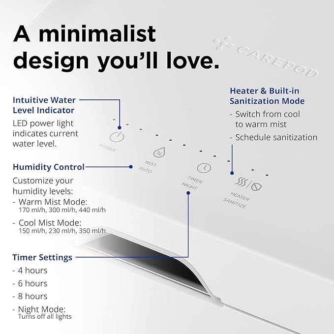 • BUILT-IN SANITIZATION FOR PEACE OF MIND: Keep your air fresh with Carepod’s heat sanitization mode, designed to eliminate harmful elements in the tank. This warm mist humidifier is perfect for maintaining cleaner air between deep cleanings and for prolonging manual cleaning frequency.