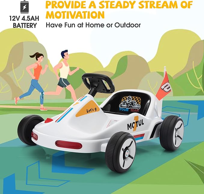 • 【POWERFUL PERFORMANCE】Go kart Equip with dual 25W motors and 12V 4.5AH batteries, it has two speed modes of 1.8-3.7MPH. Long battery life allows children to play without interruption.