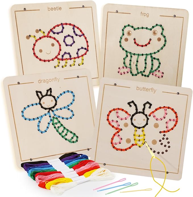 • Sewing Kit for Kids: Featuring 4 unique wooden lacing templates, 10 vibrant colors of yarn, and 4 plastic threading needles, offering a rich hands-on exploration and creative experience. As kids thread the colorful strings through the holes in the wooden boards, they develop hand dexterity, finger strength, and hand-eye coordination. These skills are crucial for future tasks such as writing, buttoning clothes, and using utensils.