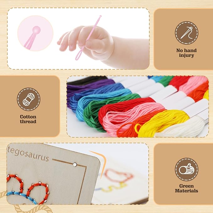 • Sewing Kit for Kids: Featuring 4 unique wooden lacing templates, 10 vibrant colors of yarn, and 4 plastic threading needles, offering a rich hands-on exploration and creative experience. As kids thread the colorful strings through the holes in the wooden boards, they develop hand dexterity, finger strength, and hand-eye coordination. These skills are crucial for future tasks such as writing, buttoning clothes, and using utensils.