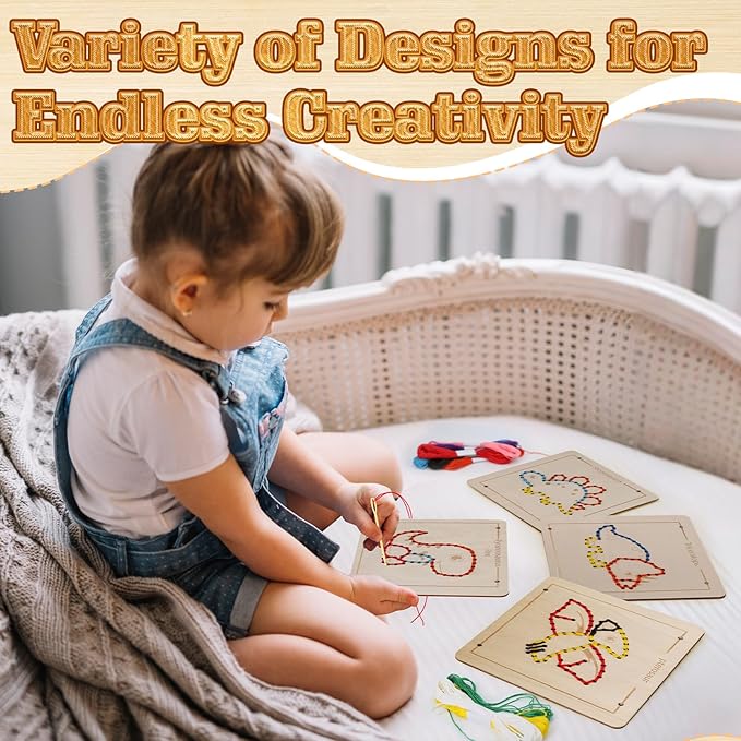 • Parent-child Interaction: Offering an ideal opportunity for parent-child interaction, this lacing activity guides you and your little one on a creative and educational journey. Whether you’re threading vibrant yarn through the wooden templates together or exploring various designs, these moments become meaningful learning experiences that strengthen your bond and make playtime both educational and fun.