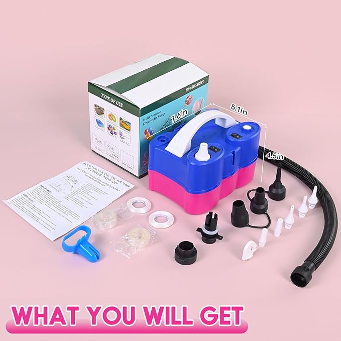 • 3-IN-1 Electric Balloons Pump: With this AC 110V-120V 600w electric air pump, you’ll receive everything you need for inflating various inflatables. You Will get 1 electric air pump with dual inflation ports and deflation port, 2 flat nozzles, 2 angled nozzles, 1 long bellow, 5 nozzles for inflating and deflating,1 balloon tying tool, 2 ribbons, and 2 balloon garland tool strips for easy party setup, a built-in removable balloon cutter for quick and effortless balloon cutting.