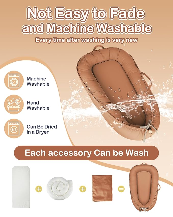 • 🌜[𝑩𝒓𝒆𝒂𝒕𝒉𝒂𝒃𝒍𝒆 π‘­π’‚π’ƒπ’“π’Šπ’„ 𝒇𝒐𝒓 π‘Ίπ’‚π’‡π’†π’•π’š 𝒂𝒏𝒅 π‘ͺπ’π’Žπ’‡π’π’“π’•] The lounger features breathable cotton fabric as the cover, super soft and breathable polyester fiberfill for the bumper filling, and 3D breathable polyester for the mat filling. It adopts a bionic design to imitate mom's comfy womb, providing a comfortable and soothing environment for the baby. The baby lounger is approved by CPC and CPSIA. All of our newborn lounger covers are manufactured under strict supervision by a meticulous quality control team to ensure that the lounger covers meet all standards.