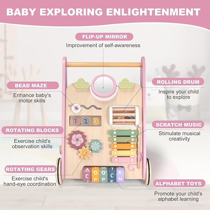 • 🌟【Develops Key Early Skills】Beyond a baby walker toy, this wooden activity walker cultivates creativity and problem-solving. As a push baby walker and pull learning walker, it enhances coordination for ages 6-12 months. The wooden push walker’s multi-sensory features foster cognitive growth – a true montessori walker.