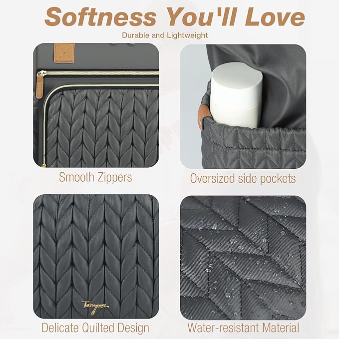 • Quilted Materials:Tonyeee diaper bag with 3D herringbone nylon quilting,achieve a perfect blend of practicality and fashion. While studded feet in the bottom keep the bag clean and off the ground