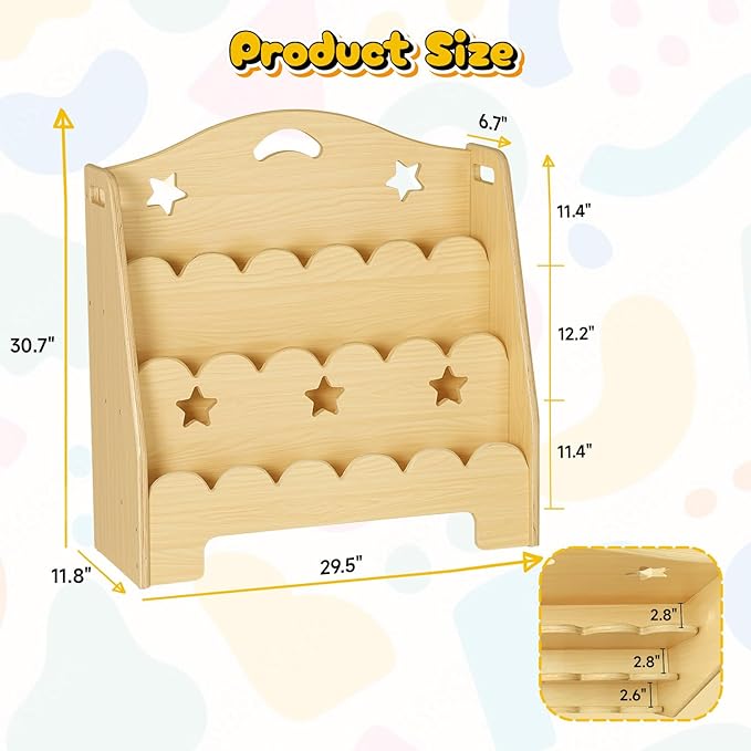 • DESIGNED FOR KIDS: At 29.5" x 11.8" x 30.7" (L x W x H), this small book shelf has a right height for children, allowing them to easily reach their favorite books. Books can be displayed by front cover instead of the spine, making it easier for kids to choose books, fostering good habits of reading and organizing. Also,the edges and corners of the wooden bookshelves are smoothly rounded off and a metal anti-tipping anchor ensure the safety of children when using it