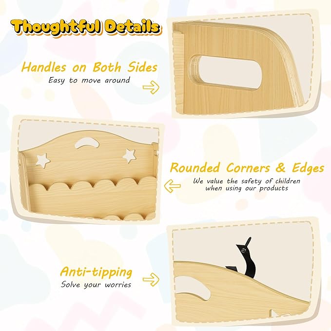 • MATERIAL: This ONBRILL montessori wood kids bookshelf is made of 0.7" thick poplar wood, which is more sturdy and durable than other shelves made of wood chips in terms of structure, it can be used for many years. It is also easy to clean and not easily scratched, simply wipe the stain gently with a damp towel